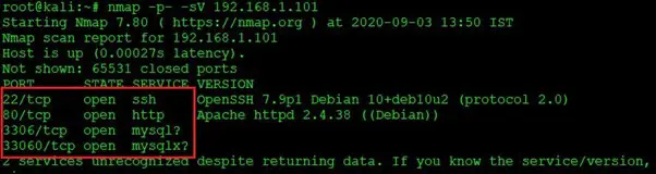 We can see that port 80 and port 22 are open on the target machine. These ports are being used for the HTTP and SSH services, respectively. Other two ports 3306 and 33060 are being used for the MySQL services.