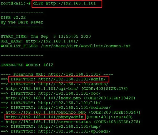 In order to identify the hidden files and directories in the application, we used the Dirb utility. The output of the dirb scan can be seen in the below screenshot: