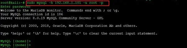 The next identified open port is 3306, through which MySQL server was running. We tried to connect with the MySQL port by using the default username and password. This time the default credentials worked perfectly, and we are able to log into the MySQL server as root user. The commands used and the result of the command can be seen in the following screenshot:
