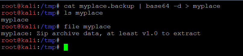 - cat myplace.backup | base64 -d > myplace (It will decode the myplace.backup file and store the decoded data into another file named myplace)