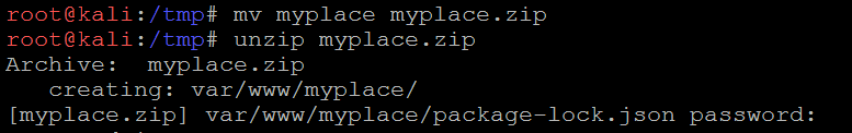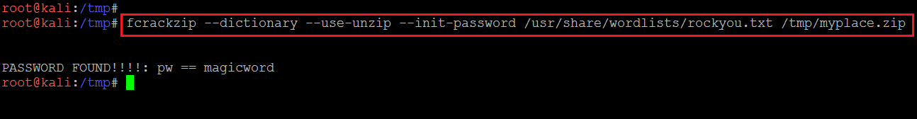 Command Used: fcrackzip --dictionary --use-unzip --init-password /usr/share/wordlists/rockyou.txt /tmp/myplace.zip