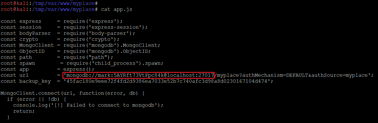 First, I checked the app.js file and found a MongoDB connection string which can be seen in the following screenshot.