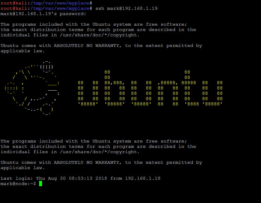 In the highlighted area in the above screenshot, we can see a connection string containing a username and password to connect on port 27017. However, this port is not publicly available. Since we know by the nmap scan that port 22 was found open other than the HTTP port, let’s use this username and password on the SSH port. It can be seen in the following screenshot.