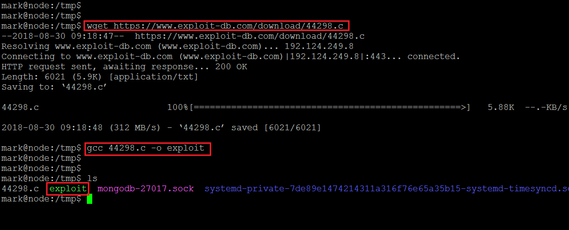 User “Mark” did not have write permission in the home directory, so I changed the current directory to “tmp” and used the wget utility to download the exploit on the target machine. Once the exploit has been downloaded, I used the GCC complier to compile the exploit; after the compilation, it generated an executable which can be seen in the above screenshot.