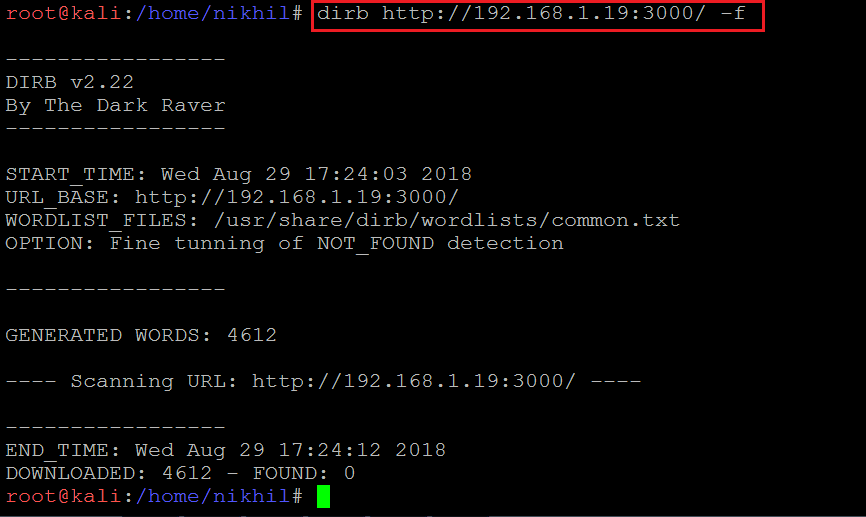 As I could not find any further entry point from here, I decided to run Dirb on the target machine to find other files/folders in the application. However, it could not enumerate any information which could be explored further. The Dirb screenshot can be seen in the screenshot given below.