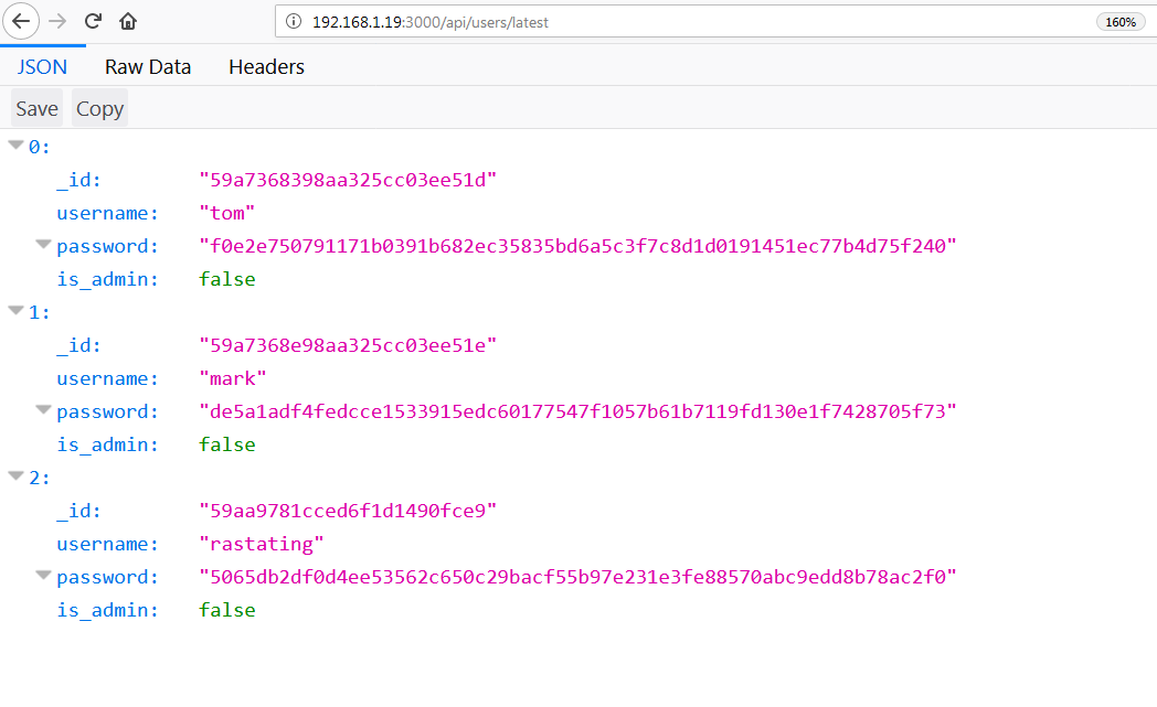 As you can see, we have hit the jackpot this time! We can see some username and password hashes on the identified URL, but all of them are normal users because is_admin is showing false.
