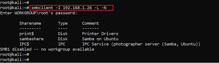 - smbclient \\\\192.168.1.26\\smbshare -N -L