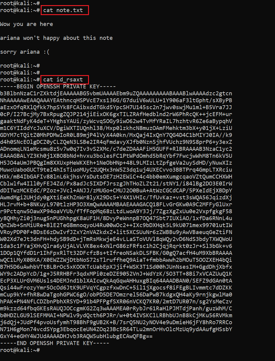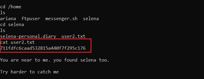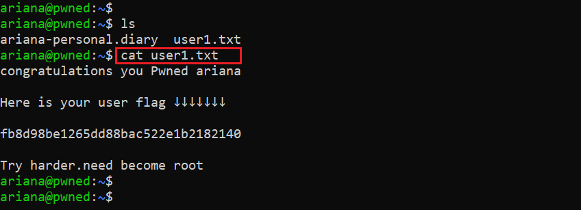 In the above screenshot, we can see that the username “Ariana” worked and we are successfully logged into the target machine through SSH. We found the first flag in the home directory: