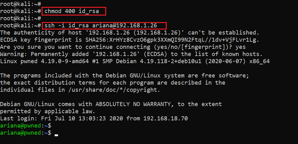 From the previous step, we know that there are four usernames and we have one key. Therefore, we will check every username one by one for an SSH login. However, before using the key, we have to change the key permission to 400.