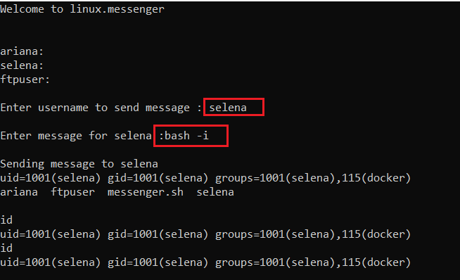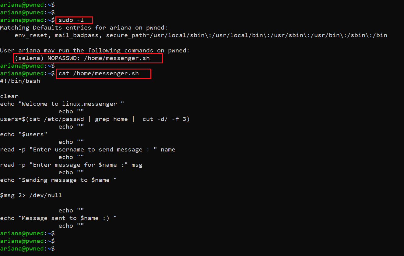 The output of the sudo -l command shows that Ariana user can run the messenger.sh file as a Selena user. We ran the program with sudo and used bash -I, which gives us the Selena user access. It can be seen in the following screenshot.