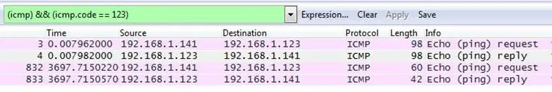 The filter sorted the ICMP packets with code 123, and as can be seen below, there are only four packets which contain code 123.
