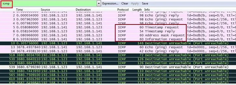 As can be seen in the above diagram, it is an ICMP based scan and the first request is an ICMP echo request; after that it sends the ICMP timestamp request, then it sends the ICMP address mask request, and at last it sends the ICMP information request. The same pattern is also available in the trace file where we applied the filter for ICMP packets.