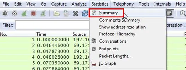 Analysis - We can check out the packets rate per second from the summary options. Select > Statistics> Summary