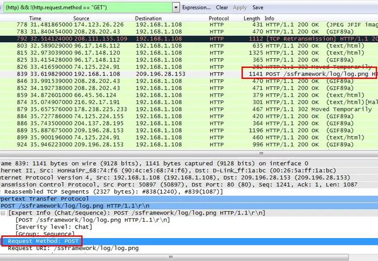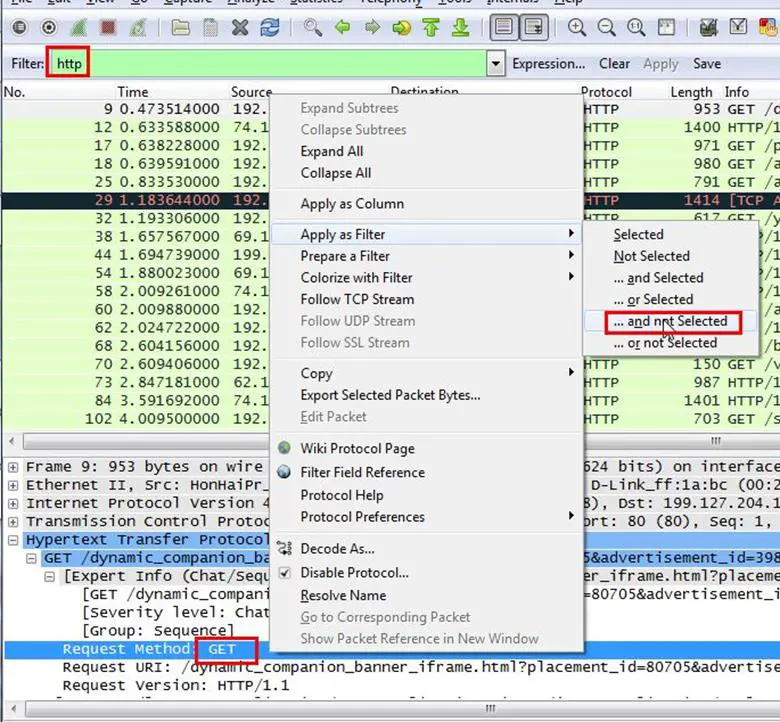 Analysis - For this task we need only the POST request, so we will first remove the GET request. We apply a filter for removing the GET request. As can be seen below, just right click on the request method GET and select Apply as Filter > and not selected