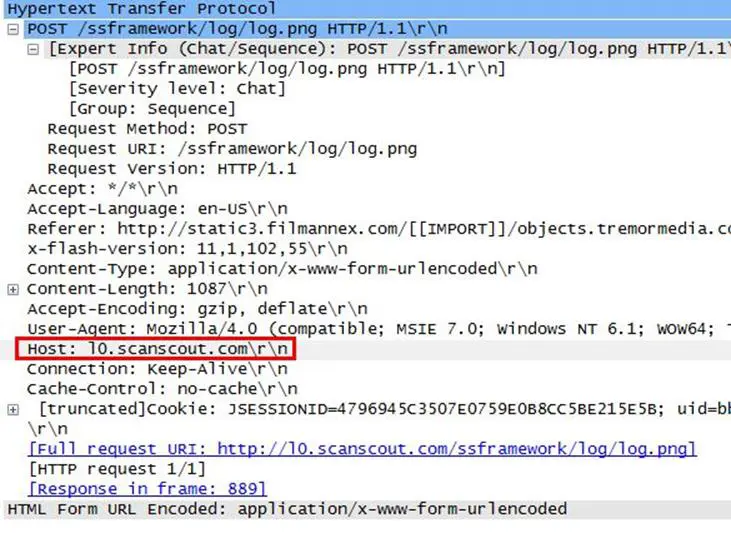 Analysis - Well this is not hard. Our first hint is to find the POST request, and there are only three of them, and next we have to find which request header contains the scanscout.com. We checked out all three requests and found one of the request headers is for scanscout.com.