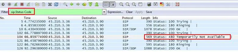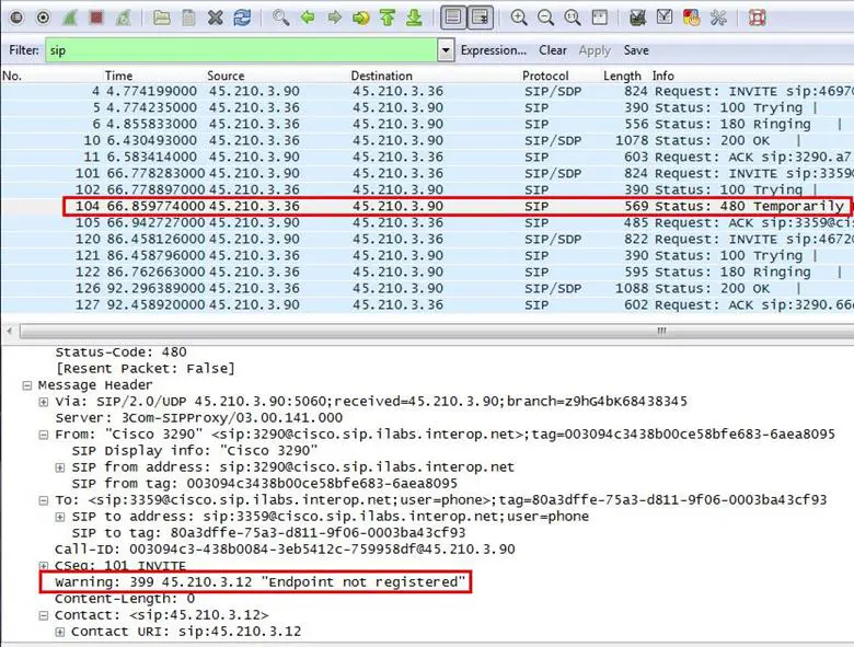 Analysis - Expand the 480 error code packet in the message header section. We can see the warning message "Endpoint not registered".
