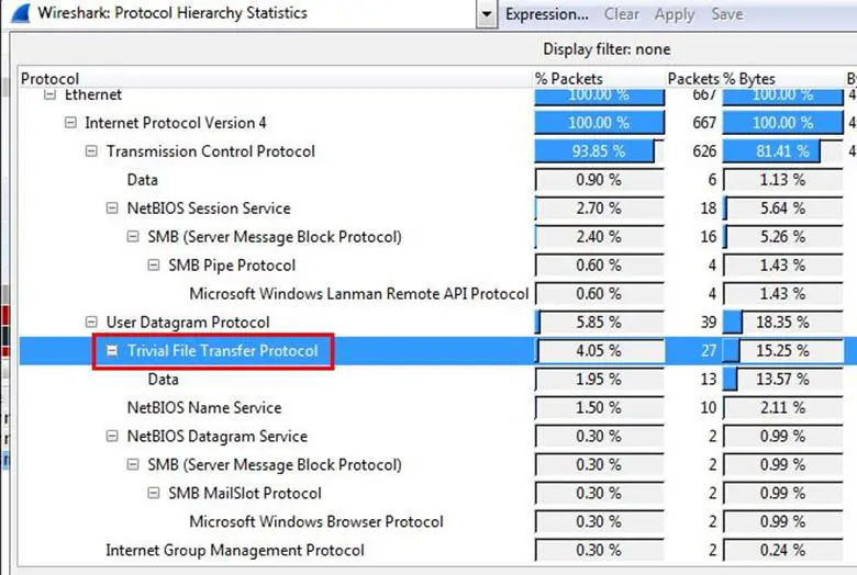 As can be seen below, the Trivial File Transfer Protocol is being used for transferring data.