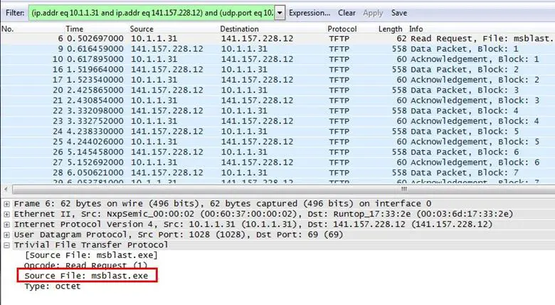 Analysis – First, we applied the filter for TFTP application, and as can be seen, there is an exe file, mblast.exe, which is transmitting to 10.1.1.31.