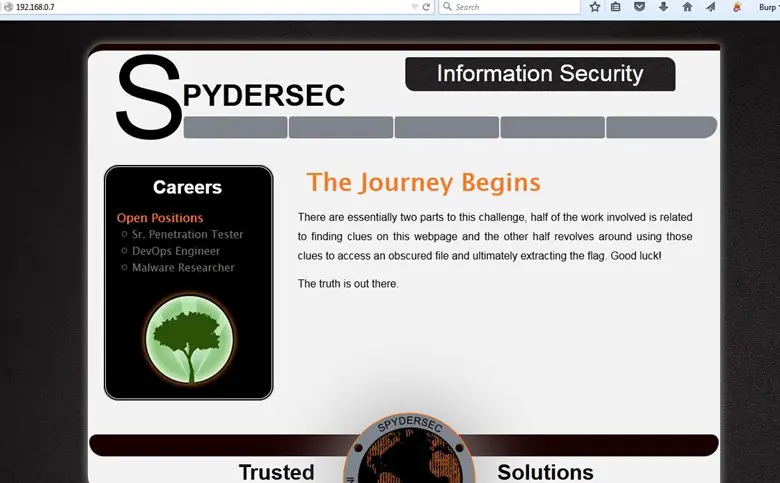 Here is another interesting challenge we are going to solve. The vulnerable machine's name is SpyderSec. We hosted the machine in VirtualBox and fired nmap on it. After running nmap, we found only one open port, which was port 80. We opened the IP and we found a webpage there.