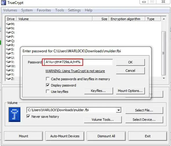 Now we have two things mulder.fbi file and a password type string. After googling about video lock, we found article about hiding message in a video by using TrueCrypt. We launched TrueCrypt, mounted a drive, and it asked for the password. We used that string value and it created a disk in my computer.