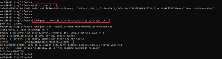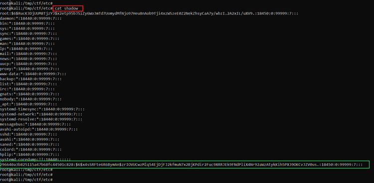 In the highlighted area, we can see that we have also found the password hash from the shadow. We have the hash of the password which needs to be cracked. We will be using John the Ripper for cracking the password.