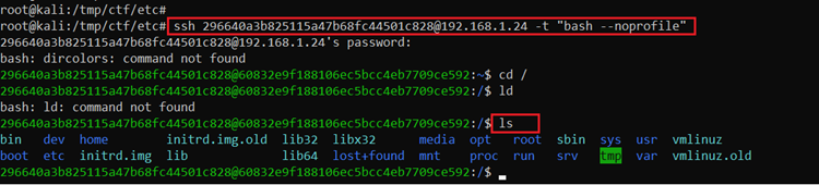 In order to bypass the rbash restrictions, we used --noprofile option with SSH, which disables the rbash profile while logging into SSH. It can be seen in the following screenshot.