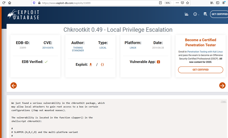 As we can see in the highlighted area, we got a chkrootkit package and its version information. We quickly checked the local exploit for this version of this program and the first Google result shows an effective local privilege escalation exploit: