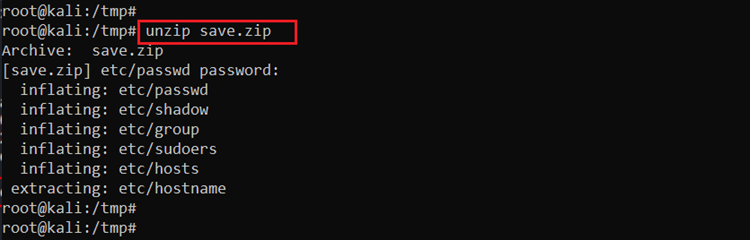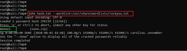 From the previous step, we know that we have a password-protected zip file which we downloaded from our attacker machine. John the Ripper is one of the best open source-password cracking tools. We will be using it to crack the password of the zip file. Another good thing is that it is available by default in Kali Linux, so we don’t need to configure it before using.