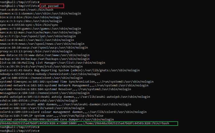 We started checking each file on the attacker machine one by one. The /etc/passwd file contains all the user information, which can be seen in the following screenshot.