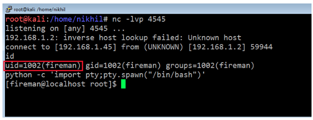 After executing the above commands in a sequence, we got another reverse shell of the target machine, but this time we got fireman’s user access of the target machine which can be seen in the following screenshot.