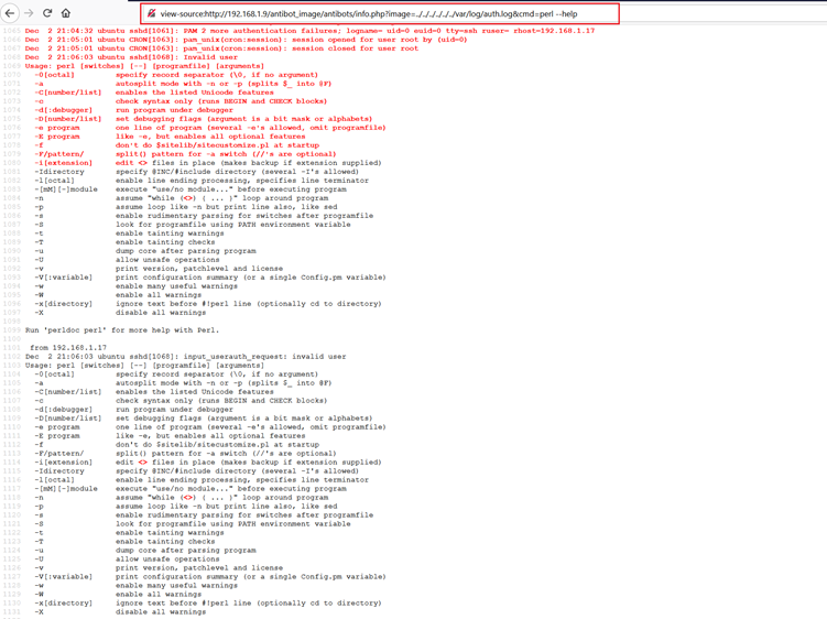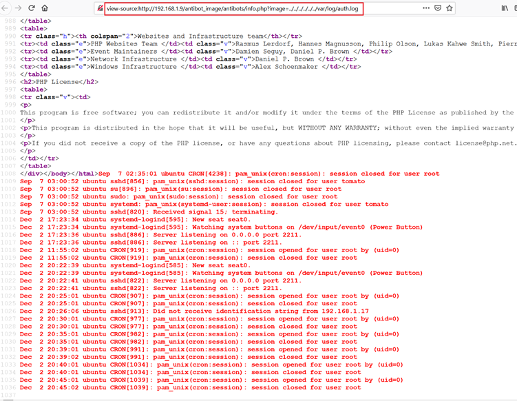We can see the ‘passwd’ file contents in the highlighted area of the above screenshot. From the ‘/etc/password’ file, we find information of all the available users on our target machine, but we don’t have any passwords so far, so we cannot log in to SSH. However, we can read other files on the server by guessing their correct path. We were able to read ‘auth.log’ file, which can be seen in the following screenshot:
