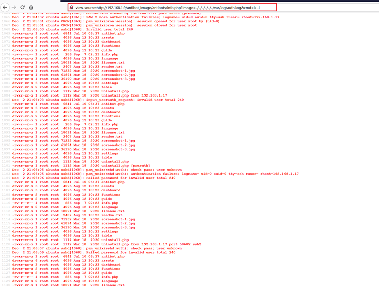 As can be seen in the above screenshot, we provided the php execution code with the SSH command. We verified the log file, and the code was successfully written into the log file. Since the include function was being used for this parameter it means we can include this file for executing commands and run any system commands on our target system. So, let us verify this by running the ls -l command. The output can be seen in the following screenshot: