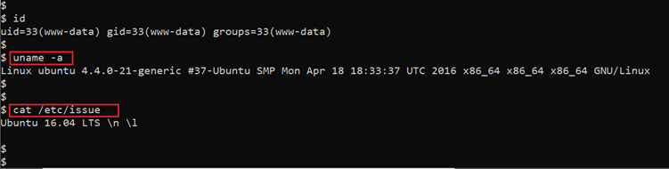 After getting the shell access of the target machine, we started exploring the target machine to gather information about the running operating system (OS) and kernel version. In the below screenshot, we can see the OS and version information on the target machine: