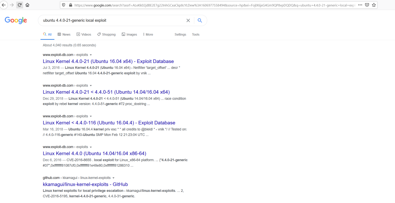 The highlighted area shows our target machine is running an older version of Ubuntu (16.04) and the kernel version is as well. Search using Google find an available exploit to proceed further towards our goal.
