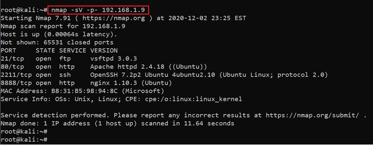 From the scan results, we found that port 21 is open on the target machine, which is being used for FTP service. Port 2211 is being used for SSH and port 8888 and 80 are being used for HTTP services.