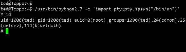 After that I used the "id" command to check whether ted is a root user or not. It shows that ted is not a root user in the target machine. Now we need to escalate the privilege to get to the root.