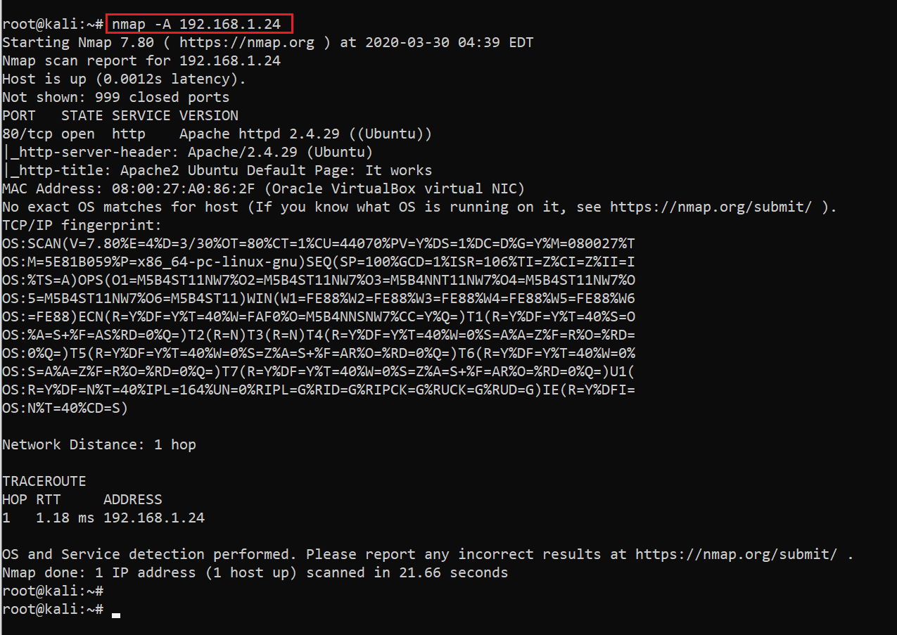 We can see above that port 80 is open on the target machine on which the HTTP service is running. The above scan also provides some further information about the target system configuration that may be useful for us in the later stages.