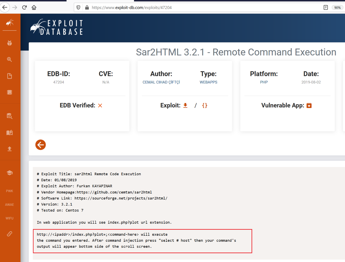 From the previous step, we got to know that our target application is the sar2HTML application and the version of that application is also visible. So I quickly ran a Google search to try to find an available exploit for it. The results of the Google search can be seen in the following screenshot: