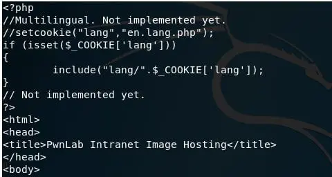 - Now that we have the code uploaded, we need a way to execute the code. While looking into the code of the index, it can be seen that the LANG parameter can be used for this purpose.