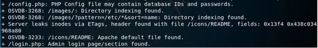 - This point of time, I usually start nikto, and I did the same in this case as well. Below we can see some interesting findings from nikto.