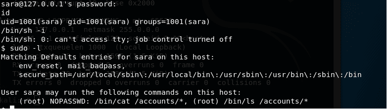 21. Let’s try to login with user Sara. Running sudo -l worked, which means Sara is in the sudoers group and can perform the listed actions. Sara can run the commands cat and ls for /accounts/*, which can be exploited.