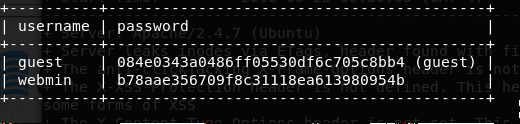 19. Below are the contents (username and password) for two users: guest and webmin.