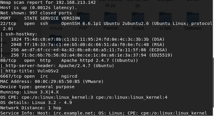 3. As is the norm, we now need to find what services are running, what ports are exposed on the system. Below is the screenshot for the nmap scan result. We can see that ports 22, 80 and 6667 is open.