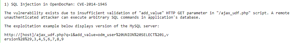 9. A quick search reveals that this version of OpenDocMan is vulnerable to SQL injection attacks. Below is the snippet from the disclosed vulnerability where the attack vector is used to enumerate the database.