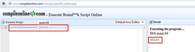 As we can see the result ++++++[>++++++++<-]>++++.+.----.-.. What the hell is this? We Googled this code but can't find anything. So the question arises again, what is this? Is it any programming language? How we will identify which language it is? So we Googled for an online compiler where all kinds of languages can be compiled.