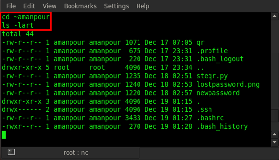 We can see in the above figure what amanpour was doing. We can see the lastpassword.png file, the QR image from where we extracted the password. We also noticed that there is ssh enabled, so there is a possibility to login via ssh if we have a valid credential. So let's check the command history of amanpour, type in cat.bash_history